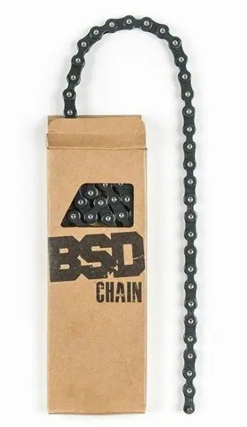 Jednorychlostní řetěz BSD je vybaven hřibovitými čepy a vyraženými logy BSD na boku. Řetěz BSD forever je vybaven chytrým předinstalovaným polovičním článkem pro lepší a snadnější přizpůsobení délky řetězu. Dodává se s 96 články.