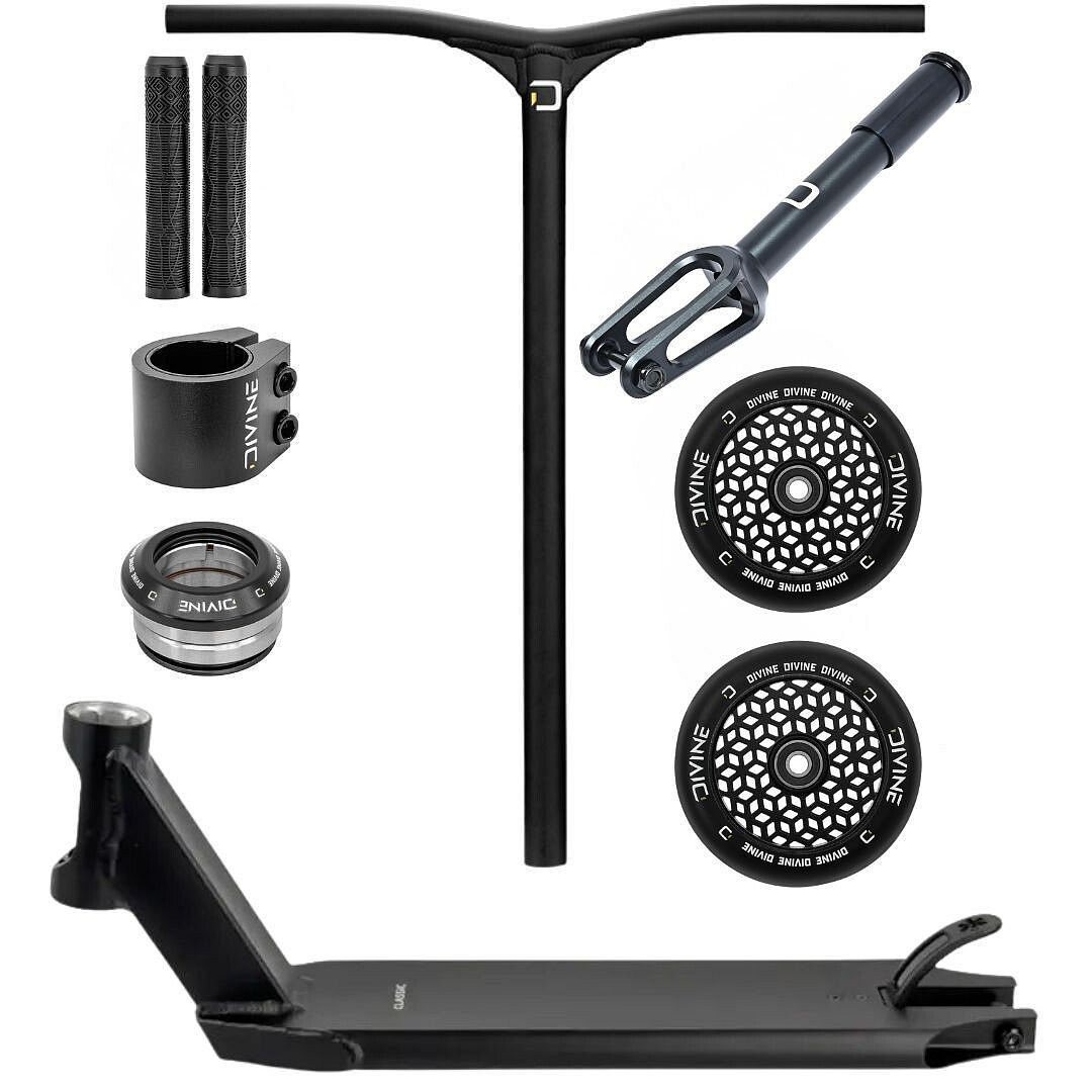 Solidny widelec IHC Divine wraz z dwoma śrubami obejmą Divine Classic trzymają hulajnogę razem, podczas gdy lekkie aluminiowe kierownice Divine Alloy 650 mm zapewniają zwinne i wygodne prowadzenie.