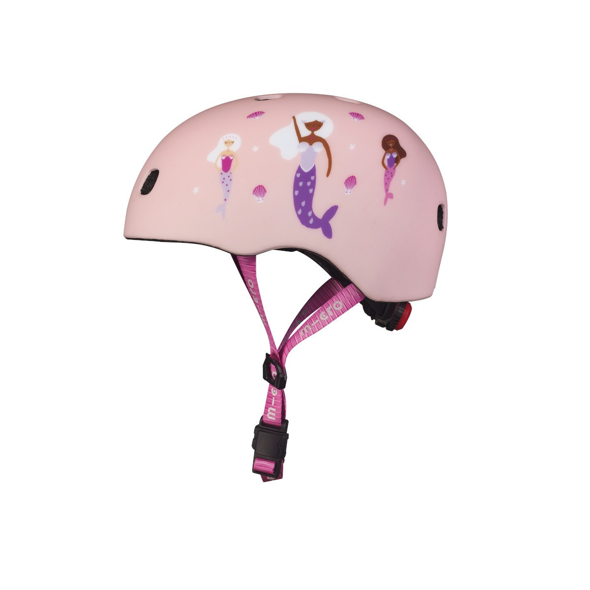 Bezpečná helma značky Micro s nastavitelnou velikostí pomocí upínacího kolečka. Jedná se o helmu v matné růžové barvě s motivem mořské panny. Helma je vhodná pro jízdu na koloběžce, dětském odrážedle, kolečkových bruslích a skateboardu. Extra polstrování uvnitř helmy pro větší komfort a bezpečí. 8 větracích otvorů zajistí kvalitní odvětrávání hlavy. Inovativní magnetický systém zapínání výrazně zvyšuje bezpečnost a zjednodušuje zapínání řemínku pod bradou. Řemínek je reflexní pro ještě vyšší bezpečnost. Helma má LED světlo se třemi režimy (2 varianty blikání, 1x svícení). Baterie (CR1632 3V) je vyměnitelná otočením červené krytky za pomoci větší síly. Velikost helmy M (52-56 cm) pro věk cca. 6+ let. Při výběru helmy doporučujeme uživateli změřit obvod hlavy a dle naměřených hodnot vybrat správnou velikost. Jako u všech helem Micro je i zde součástí balení textilní náramek v barvě helmy. V souladu s