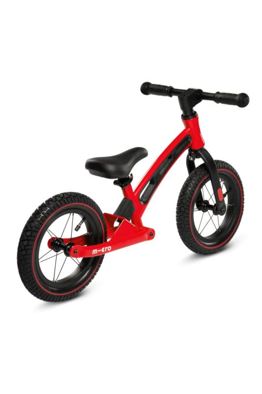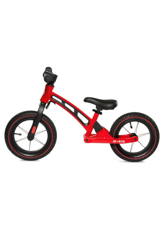 Micro Balance Bike Deluxe to dziecięcy leżaczek i rowerek do skakania w kolorze czerwonym z pompowanymi kołami 300 mm, szeroką kierownicą i tylnym zawieszeniem. Rama środkowa jest perforowana, aby odciążyć bramkarza i została zaprojektowana tak, aby nie przeszkadzała nawet najmniejszym rowerzystom podczas jazdy lub wysiadania. Dla większego komfortu kierowcy tylny widelec jest wyposażony w gumowe zawieszenie. Kierownica tego koła do odbijania znajduje się 52 cm nad ziemią. Mają prosty kształt o łącznej szerokości 41 cm. Gumowe uchwyty posiadają elementy ochronne i dobrze trzymają. Siodło pokryte jest skórą i bardzo wygodne dzięki dokładnemu wyściełaniu. Jest przyjemny w dotyku i zmywalny. Regulacja wysokości w zakresie 38 - 44 cm. Balance Bike Deluxe jest wyposażony w pompowane koła o średnicy 300 mm dla większego komfortu i szybkiej jazdy. Koła wyposażone są w klasyczny samochodowy zawór do pompowania.