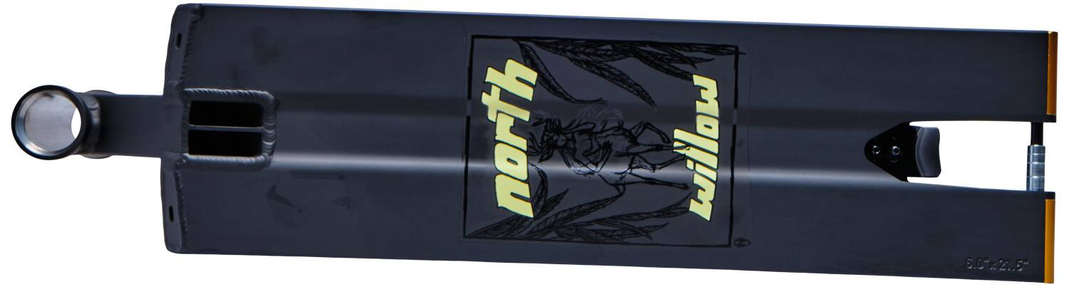North Scooters to kanadyjska marka skupiająca się głównie na jeździe ulicznej. Waga tej deski to 2020 gramów , co jest świetnym wynikiem w porównaniu do wymiarów deski, które wynoszą 22.5"/572 mm długości , 6"/152 mm szerokości i 426 mm przestrzeni na nogi .Materiał płyty to wysokiej jakości aluminium , a ponieważ płyta jest wykonana z jednego kawałka , nie jest nigdzie osłabiona i wytrzymuje spore obciążenie. Do deski zmieszczą się kółka o maksymalnej średnicy i szerokości 120x30 mm . Na końcu płyty znajduje się stalowy błotnik stały.