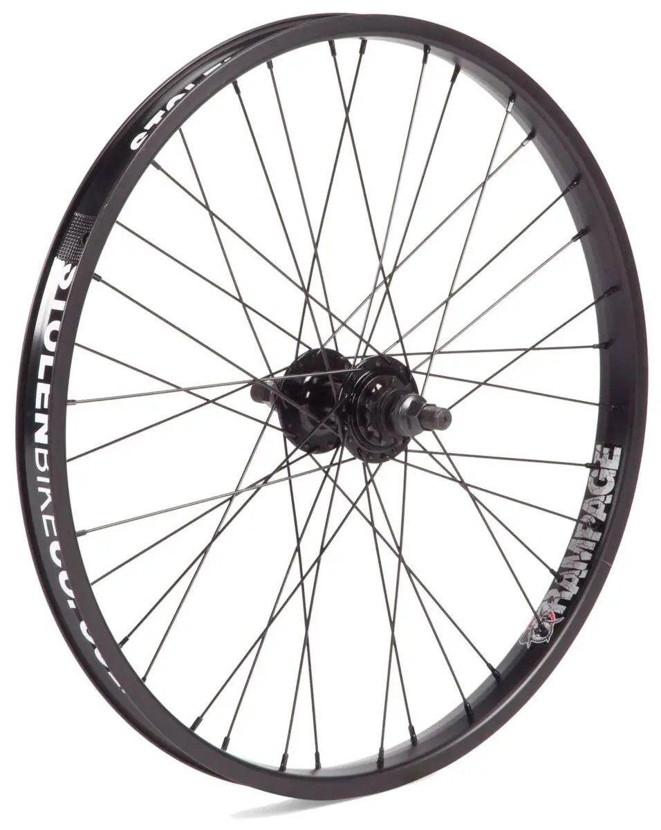 To jest tylne koło Stolen 22" Rampage do rowerów freestyle BMX. Tworząc dwuścienne obręcze w 22-calowym Rampage, Stolen starał się zapewnić sztywny, a jednocześnie lekki rower, aby kolarze mogli wykonywać triki i skakać bez łatwego zginania obręczy. Głośna piasta kasety zapewnia zestaw o niskich wymaganiach konserwacyjnych i natychmiastową reakcję pedału. Uszczelnione łożyska są łatwe w utrzymaniu i odporne na zabrudzenia, dzięki czemu to tylne koło Stolen idealnie nadaje się do użytku na zewnątrz.